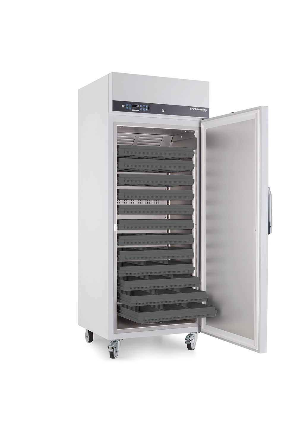 Complete set: Kirsch MED-520 medicijnkoelkast inclusief stijlpoten. De stijlpoten zijn te verwijderen waardoor de kast minder hoog is. (1960mm->1930mm). De Kirsch MED-520 medicijnkoelkast biedt 500 liter koelruimte met een temperatuurbereik van +2°C tot +20°C. De medicijnkoelkast wordt standaard geleverd met 12 kunststof laden met vakverdeling.