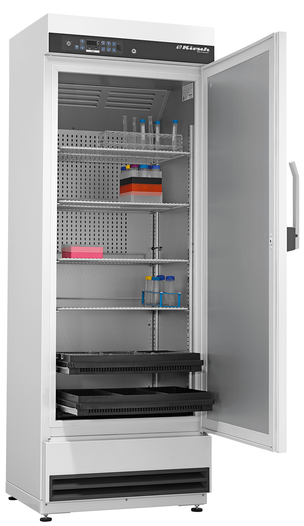 De behuizing en de deur is vervaardigd uit RVS, gecoat met een witte krasbestendige lak. De Kirsch LABEX®-340 heeft een snoerlengte van 1,8 meter en wordt geplaatst op verstelbare poten om de koelkast ook op een ongelijke vloer stabiel te kunnen installeren. Het interieur bestaat uit aluminium wanden met een beschermende coating. Verder is de kast ingericht met draadroosters en kunststoffen laden die naar wens kunnen worden ingedeeld.