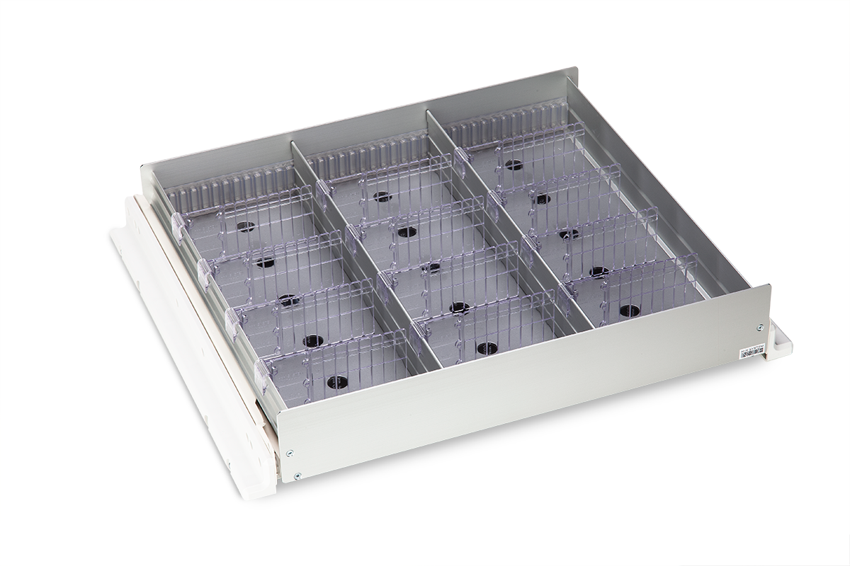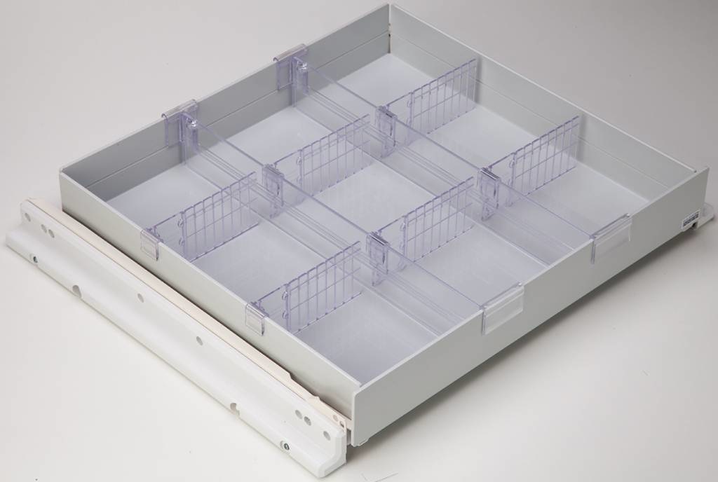 Kunststof medicijnlade met eigen frame en indeling. De lade heeft een dichte bodem en is voorzien van 3 banen en 6 tussenschotjes. De indeling is geheel naar eigen wens in te delen.